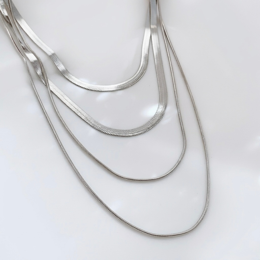O Colar Aura traz a tendência das camadas pronta para usar. Este modelo exclusivo combina quatro correntes de diferentes texturas e comprimentos, unindo a modernidade da malha fita com a delicadeza da corrente serpente (snake). Com banho de prata de alta qualidade, é a escolha ideal para quem busca um visual marcante e minimalista ao mesmo tempo.